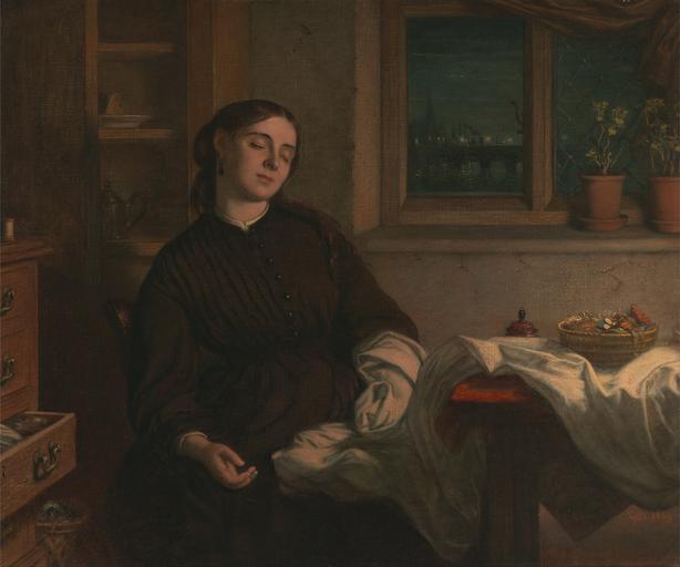 | Keywords: Charles West Cope - Home Dreams - Google Art Project.jpg No inscription Inscription _Signed_and_Dated Signed and dated in red paint lower right CWC 1869 monogramed Not on View Oil on canvas on panel plate sleeping night night interior seamstress Victorian woman dream thread window sill spool window window drawers furniture components plants plants chair table costume thimble tankard sewing basket cityscape genre subject special url_id IgFoLfiuN0X84g PD-old-100-1923 1890 Charles West Cope Google Art Project works by Charles West Cope Sleeping women in art |