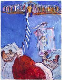 Keywords: Charlotte Salomon - JHM 4175.jpg Leben oder Theater Ein singspiel http //www jhm nl/collectie/museumstukken/04175-01 Museum page ca 1940 1942 Creator Charlotte Salomon gouache paper cm 32 5 25 0 Institution Joods Historisch Museum Paul Tillich and Emil Strauss Charlotte A Diary in Pictures 1963 New York Harcourt Brace World http //lccn loc gov/63014210 LCCN 63014210 ed Judith Herzberg Charlotte Salomon Life or Theater The Viking Press New York 1981 ISBN 0-670-21283-0 Mary Lowenthal Felstiner To Paint Her Life Harper Collins 1994 ISBN 0-06-017105-7 Michael P Steinberg Editor Monica Bohm-Duchen Editor Reading Charlotte Salomon Cornell University Press 2005 ISBN 0-8014-3971-X Christine Fischer-Defoy and Judith C E Belinfante Biography 1917-194 in Charlotte Salomon Life or Theatre Royal Academy of Arts London 1998 ISBN 0-900946-66-0 pp 15-25 object history exhibition history Fodor Museum Amsterdam 1961 brochure credit line Charlotte Salomon Foundation Artist's monogram CS bottom right LangSwitch This work is a gouache by Charlotte Salomon part of her principal work Life or Theatre It is placed by editors at the close of Scene 1 in the Prelude There is text music and a transparency associated with this gouache For the Jewish Historical Museum interactive page http //www jhm nl/collectie/thema 27s/charlotte-salomon/leben-oder-theater 4175 use this link <gallery>File Charlotte Salomon - JHM 4175T jpg Transparency File Charlotte Salomon - JHM 4175TC jpg Combined image </gallery> Am Weihnachtsbaum die Lichter brennen - The Christmas tree is bright with candles the preceding gouache includes Christmas scenes LangSwitch The gouache depicts the fictional Charlotte Kann representing Salomon herself and always referred to in the third person in bed with her mother Franziska The text reads FRANZISKA 'Im Himmel ist es viel schöner als es auf dieser Erde ist - und wenn dann deine Mutti ein Engelein geworden ist dann kommt sie runter und bringt dem Häschen und bringt einen Brief indem sie sagt wie es im Himmel wie es im Himmel oben ist ' Franziska war ziemlich sentimental veranlagt Oft nahm sie das Kind zu sich ins Bett und erzählte ihr von einem Leben nach dem Tode in himmlischen Sphären - das ganz herrlich sein sollte und nachdem sie furchtbare Sehnsucht zu haben schien und sie fragte Charlotte oft ob es nicht schön wäre wenn ihre Mutter ein Engel mit Flügeln würde Charlotte fand das auch sehr schön nur aber bat sie die Mutter nicht zu vergessen ihr in einem Brief - den die als Engel persönlich zu überbringen hatte und auf Charlottens Fensterbrett deponiert werden mußte - mitzuteilen wie es im Himmel oben sei Nach derselben Melodie LangSwitch FRANZISKA 'In Heaven it's much nicer than down here - and when Mommy has turned into a little angel she'll come down and bring you her dear little kitty and a letter telling you what it's like up there what it's like up in Heaven' Franziska was of a somewhat sentimental nature at heart She often took the child to bed with her to explain what life after death was like in the celestial spheres how simply glorious it all must be and how frightfully she longed to be there too and she often asked Charlotte how splendid it would be if her Mommy turned into an angel with wings Charlotte could only agree but asked her mother especially not to forget to tell her in the letter which she had to deliver personally as an angel and leave on Charlotte's windowsill what it was all like up there To the same tune PD-old-70 PD-US-not renewed Uruguay Round Agreements Act URAA depending on whether their original publication in the US coincided or not with their publication abroad It is not Commons policy to host URAA restored works accession number 4175 Uploaded with UploadWizard Charlotte Salomon