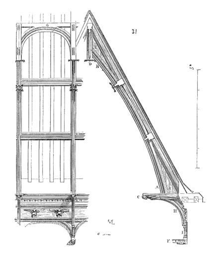 | Keywords: Charpente.cathedrale.Ely.png La nef et les transsepts de la cathédrale d'Ély sont encore couverts par une belle charpente qui date de la fin du XIV<sup>e</sup> siècle Nous donnons 31 une ferme de cette charpente ainsi que l'entre-deux des fermes La grande courbe A B est d'un seul morceau; elle s'assemble à sa base dans le grand blochet C à son sommet dans le faux poinçon D Carpentry Viollet-le-Duc Ely Cathedral Viollet-le-Duc | ||||