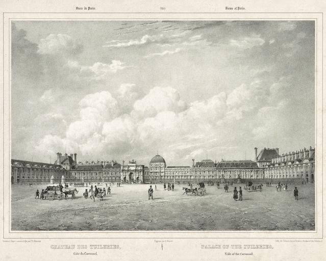 | Keywords: Chateau des Tuileries, côté du carrousel, ca. 1833-39 II.jpg Palace of the Tuileries side of the carrousel Print shows a view of the Tuileries Palace with the Arc de Triomphe du Carrousel and a large plaza with pedestrians and carriages in the foreground Published Paris Gihaut frères Editeurs Boulevart des Italiens 5 between 1833 and 1839 1 print lithograph Size cm 55 8 40 4 Institution Library of Congress object history exhibition history credit line LOC-image pga 05798 Chateau des Tuileries côté du carrousel Palace of the Tuileries side of the carrousel / / dessiné d'apre nature et lith par Ph Benoist ; figures par A Bayot ; lith de Gihaut frères Editeurs Boulevart des Italiens 5 accession number PD-100 East facade of the Palais des Tuileries Arc de Triomphe du Carrousel from the east Historical images of Arc de Triomphe du Carrousel Historical images of Place du Carrousel Paris in the 1830s Lithographs of Paris Adolphe Jean-Baptiste Bayot Images of Paris from the Library of Congress |