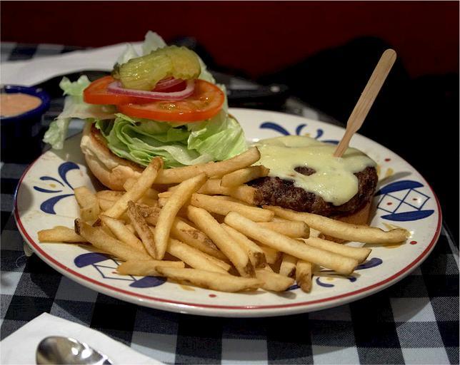 Keywords: cheeseburger french fries pickle onion lettuce tomato plate meal potatoes american fast food snack beef informal restaurant classic traditional sandwich bun