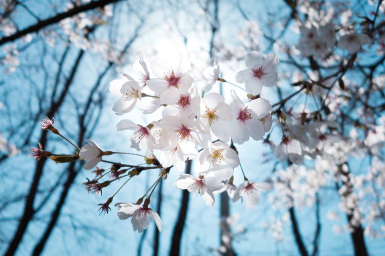 Keywords: cherry blossoms cherry pink blue sky blossom bright spring flower tree blooming
