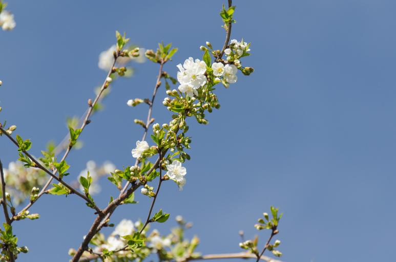 Keywords: cherry flower leaves branch spring bloom garden bud white flowers sky blue