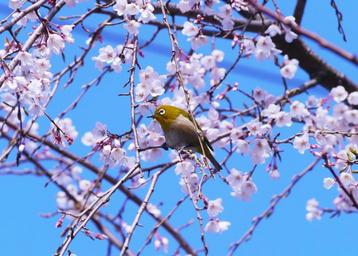 Keywords: cherry spring flowers japanese white-eye bird weeping cherry tree in 2016 3 months otsu city yokosuka kanagawa japan branch pink blue green blue sky in full bloom cute antomasako potential