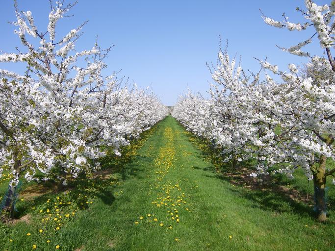 Keywords: cherry trees cherry blossom spring white sky meadow april