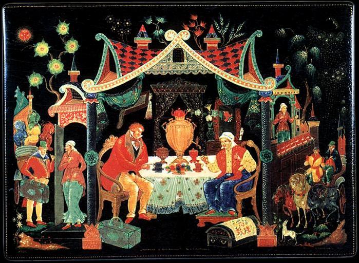 | Keywords: Chichikov visiting Korobochka (Salabanov).jpg ru Чичиков у Ко обочки Шкатулка 1936 Г ПИ 1936 http //palekh narod ru/win/salab_vm htm Василий ихайлович Салабанов 1902 1941 other versions Custom license marker 2016 01 26 PD-Old-70 Vasily Salabanov Palekh Miniature Dead Souls |