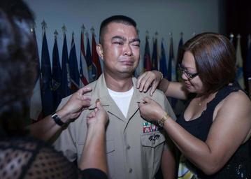 | Keywords: Chief pinning ceremony at NAF Atsugi 140916-N-EI558-055.jpg en Chief Construction Electrician Ferdinand Diwa of Naval Computer and Telecommunications Station Far East has his anchors pinned on by his wife and mother during a chief pinning ceremony at Naval Air Facility Atsugi's Cinema 77 A total of 12 chiefs from NAF Atsugi and its tenant commands received their anchors and combination covers during the ceremony U S Navy photo by Mass Communication Specialist 3rd Class Ryan G Greene/Released 2014-09-16 Seaman Ryan Greene https //www dvidshub net/image/1551447 140916-N-EI558-055 2014-09-16 04 14 NAVAL AIR FACILITY ATSUGI KANAGAWA JP PD-USGov-Military-Navy Naval Air Facility Atsugi Images from DoD uploaded by Fæ |