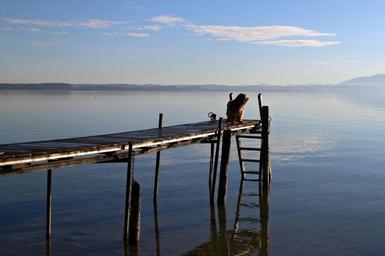 Keywords: chiemsee lake web animal dog bank blue sky water mood rest silent idyll quiet being alone still calm enjoy horizon