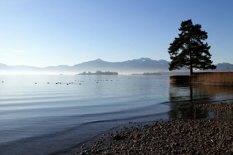 Keywords: chiemsee upper bavaria tree lake bank distant view wide vision peaceful blue