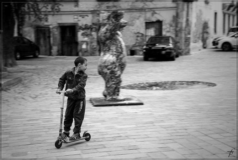 Keywords: child boy playing skating fun street black white city architecture urban