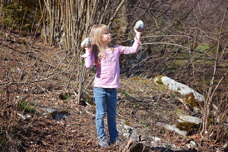 Keywords: child girl out nature stones forest play