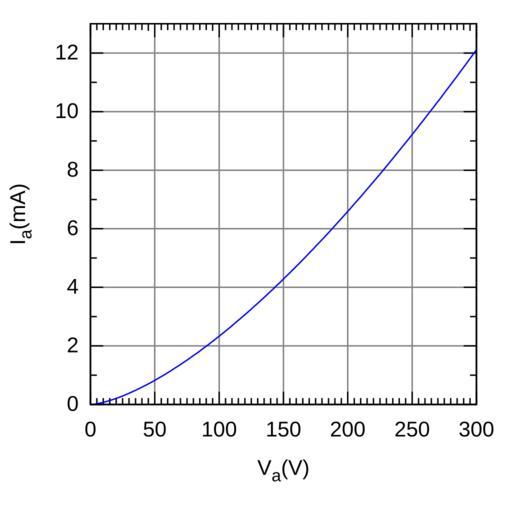 Keywords: ChildLangmuirLawGraph1.svg python <syntaxhighlight lang python > from matplotlib pyplot import from math import sqrt from numpy import linspace fig figure figsize 4 4 ax1 fig add_subplot 111 ax1 grid True A 1e-4 cathode are 1 cm 2 d 1e-2 cathode-anode distance 1cm Va linspace 0 300 100 e 1 6e-19 electronic charge m 9 11e-31 electronic mass e0 8 85e-12 permitivitty of free space def childLaw V return 4 e0 sqrt 4 e/m A V 1 5/ d 2 9 Ia childLaw Va ax1 plot Va Ia ax1 grid True ax1 set_xlabel r V_a ax1 set_ylabel r I_a fig show fig savefig ChildLangmuirLawGraph1 svg bbox_inches tight \ pad_inches 15 </syntaxhighlight> sr П иказан је г аф Чајлд-Лангмуи овог закона то јест овисност анодне ст ује о анодном напону за идеализи ану вакуумску диоду Пов шина катоде А 1 cm2 удаљеност катода-анода d 1 cm Ко иштена фо мула је из чланка Те моелект онска емисија на с пској википедији own Krishnavedala 2011-06-04 File ChildLangmuirLawGraph1 png validSVG Cc-zero Vacuum tube diagrams Images with Python source code Created with Matplotlib Device current-voltage characteristics