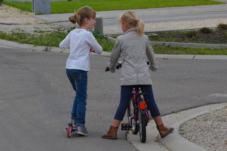 Keywords: children girls bicycle people conversation interview friends friendship