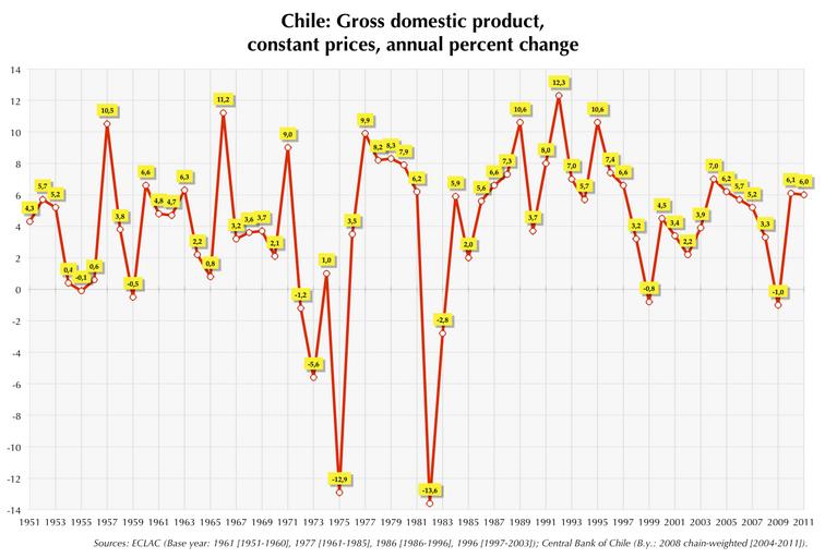 | Keywords: Chile GDP growth.png graph Chile gross domestic product growth from 1951 to 2011 Sources http //www eclac cl/deype/cuaderno37/esp/index htm ECLAC Base year 1961 1951-1960 1977 1961-1985 1986 1986-1996 1996 1997-2003 ; http //si3 bcentral cl/Siete/secure/cuadros/home aspx Central Bank of Chile B y 2008 chain-weighted 2004-2011 Economy of Chile Economic history |