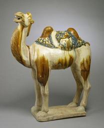 Keywords: Chinese - Camel - Walters 492383 - Profile.jpg This double-humped camel with tiger-faced saddlebag raises its head and bares its teeth Its maker modeled the figure allowed it to dry then covered it with a thin coat of white clay slip before applying lead silicate glazes of amber cream blue green and brown When the camel was later fired the glazes ran together in the kiln producing a mottled and streaked effect that evidently appealed to the Tang T'ang Chinese Tie-dyed textiles of the period have a similar character This camel like all wares with lead-fluxed glazes was made to be placed in a tomb presumably of an important person century 7 8 Technique sancai glazes earthenware cm 57 47 accession number 49 2383 7363 C K Chang Philadelphia date and mode of acquisition unknown Walters Art Museum 1949 by purchase Museum purchase 1949 place of origin China Walters Art Museum license Chinese ceramics in the Walters Art Museum Tang dynasty sancai camel statues Statues of camels of the Tang Dynasty Media contributed by the Walters Art Museum needs category review |