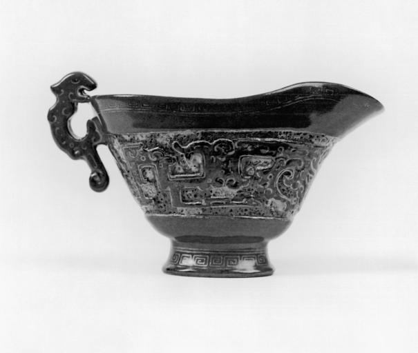 | Keywords: Chinese - Ceremonial Water Vessel - Walters 49795.jpg  This piece is olive brown flecked with tea green The motifs are those of the 11th-10th century BC on a shape inspired by ceremonial water vessels of the 10th century BC The glazes are intended to suggest the patina of an inlaid bronze long buried in the earth between 1735 1795 porcelain with tea-dust green glaze and overglaze turqoise and gold cm 12 3 accession number 49 795 5303 William T / Henry Walters Collection Baltimore date and mode of acquisition unknown Walters Art Museum Henry Walters Acquired by William T or Henry Walters Reign Mark In gold Qianlong Ch'ien-lung place of origin China Walters Art Museum license Chinese porcelain in the Walters Art Museum Media contributed by the Walters Art Museum needs category review Porcelains of the Qing Dynasty Ceremonial vessels |