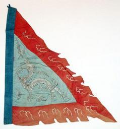 Keywords: Chinese junk flag.jpg An Imperial Chinese junk flag captured during the First China War 1839-42 It is part of a collection belonging to Sir Robert Oliver 1783-1848 Superintendent of the Indian Navy The hand sewn flag is made of silk with a cotton hoist It is a triangular shape in light blue with a darker blue hoist and red indented border There is a silver and gold dragon and pearl motif in centre surrounded by clouds with lightning flashes in the borders The dragon has four toes ca 1842 http //www nmmimages com/ service search action do_quick_search language q D3814 Author PD-Art First Opium War Flags of the Qing Dynasty Dragons chasing a flaming pearl |