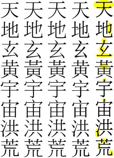 | Keywords: Chinese standard variants samples.svg Chinese characters in standardized Ming typefaces and characters found in the Kangxi Dictionary From right to left are Kangxi Dictionary forms Mainland China standard Hong Kong standard Taiwan standard Japan standard Areas in the rightmost column where there are significant differences among different standards are highlighted in yellow 玄 is not written completely in the Kangxi Dictionary because 玄 is a character in the Kangxi Emperor's given name 玄燁 It was taboo to write a character the emperor's name and so 玄 was left incomplete own Asoer 2010-05-21 Comparisons of different sets of Chinese characters ImageNote 1 400 196 8 8 418 576 2 玄 is written this way in the Kangxi Dictionary because 玄 is a character in the Kangxi Emperor's given name 玄燁 It was taboo to write a character the emperor's name and so 玄 was left incomplete ImageNoteEnd 1 ImageNote 2 405 14 8 8 418 576 2 Note lengths of horizontal strokes ImageNoteEnd 2 ImageNote 3 398 103 8 8 418 576 2 Variation between a vertical stroke with a hook and a 丿 ImageNoteEnd 3 ImageNote 4 378 147 8 8 418 576 2 Variation between using a vertical stroke and 丶 ImageNoteEnd 4 ImageNote 5 364 180 8 8 418 576 2 Variation between using a contiguous or separate 丶 and ImageNoteEnd 5 ImageNote 6 379 237 8 8 418 576 2 Note top being 廿 or 卄 and whether it is 由 or 田 below the long horizontal stroke ImageNoteEnd 6 ImageNote 7 384 293 8 8 418 576 2 Variation between using a vertical stroke and 丶 ImageNoteEnd 7 ImageNote 8 384 363 8 8 418 576 2 Variation between using a vertical stroke and 丶 ImageNoteEnd 8 ImageNote 9 350 483 8 8 418 576 2 Variation at the beginning of the stroke ImageNoteEnd 9 ImageNote 10 381 508 8 8 418 576 2 Note connected or disconnected 艹 and in 亡 using a vertical stroke or 丶 ImageNoteEnd 10 ImageNote 11 359 534 8 8 418 576 2 Note corner or curve ImageNoteEnd 11 ImageNote 12 402 548 8 8 418 576 2 Note presence or absence of hook ImageNoteEnd 12 ImageNote 13 361 523 8 8 418 576 2 Note whether or not the horizontal stroke passes the vertical stroke ImageNoteEnd 13 |