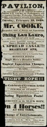 Keywords: Ching Lau Lauro 19 Feb 1928.jpg Royal Pavilion Whitechapel Road London poster of Tuesday 19 February 1828 advertising the magician Ching Lau Lauro http //www elta-project org/fedora-stg/get/elta 1146/JPEG_800_001 jpg 1828-02-19 Anon PD-old-70-1923 Ching Lau Lauro Playbills of the United Kingdom |