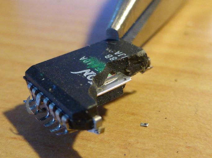 Keywords: Chip-broken-up-1.jpg de Aufgebrochener Microchip en Broken-up microchip 2016-02-19 14 49 07 own MartinThoma other versions cc-zero Images by Martin Thoma/Hardware Taken with Panasonic Lumix DMC-TZ41 Microchips