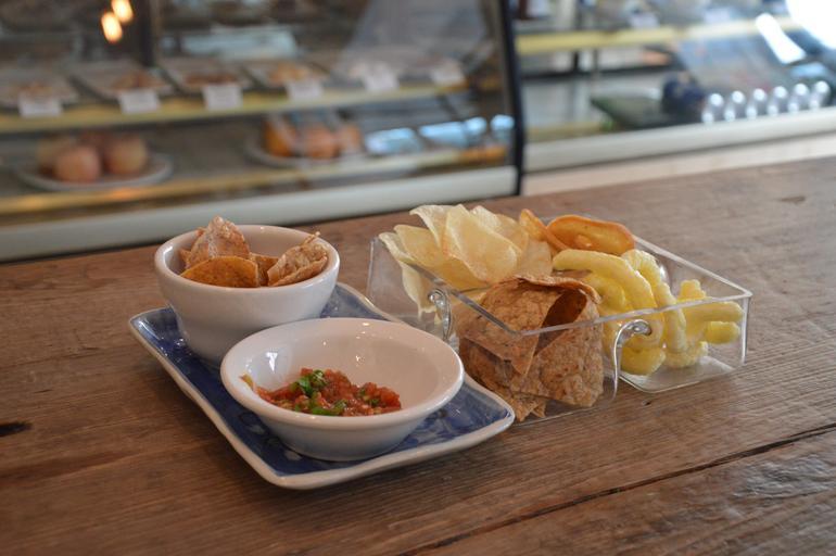 Keywords: chips fried food snack restaurant bar salsa sauce plates table eating meal