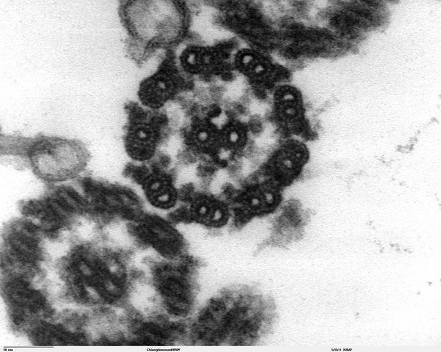 | Keywords: Chlamydomonas TEM 13.jpg Transmission electron microscope image showing an example of green algae Chlorophyta <br><br>Chlamydomanas reinhardtii is a unicellular flagellate used as a model system in molecular genetics work and flagellar motility studies <br><br>This image is a thin x-section cut through the isolated axoneme Chlamydomonas flagella have the 9+2 structure characteristic of all eukaryotic cells The axoneme has a central unit containing two single microtubules and nine peripheral doublet microtubules known as the 9+2 Dynein sidearms project from the A tubule of each doublet Also visible in this image are the radial spokes and the inner sheath Source and public domain notice at http //remf dartmouth edu/imagesindex html 2007-09-20 Dartmouth Electron Microscope Facility Dartmouth College Released into the public domain Dartmouth Electron Microscope Facility Dartmouth College Chlamydomonas reinhardtii Transmission electron microscopic images Flagella |