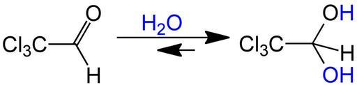 Keywords: Chloral vs. Chloralhydrate V.1.png en Formation of Chloralhydrate de Bildung von Chloralhydrat aus Chloral durch Anlagerung von Wasser own Jü 2011-05-25 Cc-zero Chemical reactions