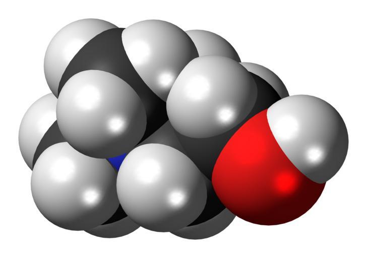 | Keywords: Choline-cation-3D-spacefill.png Space-filling model of the choline cation a water-soluble essential nutrient The nitrogen atom has a positive charge Colour code 505050 Carbon C black<br> F0F0F0 Hydrogen H white<br> F51E1E Oxygen O red<br> 3C50FA Nitrogen N blue<br> 2011-02-03 own DS Visualizer Jynto talk Ball-and-stick version cc-zero Choline Images by Jynto Space-filling models | ||||