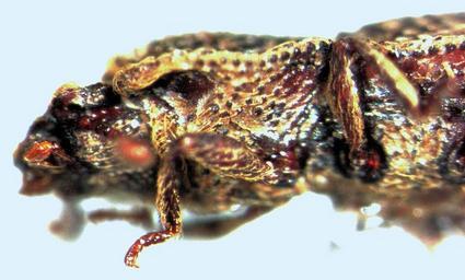 | Keywords: Chorasus2.jpg en adult Chorasus sp showing antennal groove and cavity on prothoracic hypomeron self-photographed S E Thorpe 2010-06-24 NEW ZEALAND WO near Cambridge<br /> NZ 37 79˚S 175 55˚E TMRes<br /> F -; P - 402 78ha W846-112<br /> 33 cm diam litter 72hr Berlese<br /> Edge dist 5 1m -6 1m offset <br /> RK Didham 14-Feb-08 Unidentified Zopheridae Coleoptera head and pronotum |