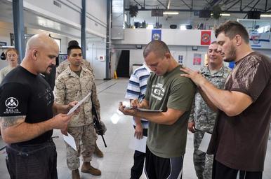 | Keywords: Chris Lytle and Matt Mitrione sign autographs at the gym during a visit to Camp Atterbury, Indiana, Sept. 20-2011 (110929-A-GI410-168).jpg en Ultimate Fighting Championship UFC fighter Chris Lytle second from right and UFC fighter Matt Mitrione right sign autographs at the gym during a visit to Camp Atterbury Indiana Sept 20 2011 The UFC fighters visited the installation and provided combatives tips to interested Service members U S Army photo by Michael Maddox/Released 2011-09-20 15 57 46 http //www defenseimagery mil/imagery html guid 0aaba79c1e8f194e65872fcbe70a4cebf72b6c38 defenseimagery mil U S Army photo by Michael Maddox 110929-A-GI410-168 Army http //www defenseimagery mil/imagery html guid 0aaba79c1e8f194e65872fcbe70a4cebf72b6c38 PD-USGov Uploaded with UploadWizard Sportspeople giving autographs Chris Lytle Matt Mitrione United States Army Combatives training Camp Atterbury |