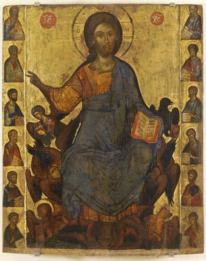 | Keywords: Christ in glory with apostles (14th c., Constantinople).jpg  Ο Χριστός εν δόξη και οι δώδεκα Α όστολοι μέσα 14ου αιώνα 78x96εκ άγνωστος ζωγράφος α ό την Κωνσταντινού ολη Εδόθη μοι  άσα εξουσία εν ουρανώ και ε ί της γης Πορευθέντες μαθητεύσατε  άντα τα έθνη  ατθ 28 18-19 κείμενο στο ευαγγέλιο  ου κρατάει ο Χριστός Ο Χριστός εικονίζεται καθισμένος σε θρόνο α ό σεραφείμ ευλογεί με το δεξί του χέρι και κρατάει ανοιγμένο ευαγγέλιο με το αριστερό Περιβάλλεται α ό τα σύμβολα των ευαγγελιστών και α ό τους δώδεκα α οστόλους οι ο οίοι  αριστάνονται σε  ροτομή και βρίσκονται σε δύο στενές στήλες δεξιά και αριστερά του http //eib xanthi ilsp gr/gr/icons asp cursort iconTitle selectFieldValue vpage 3 mid 14th century Constantinople master PD-old Files uploaded by Shakko from various sources 14th-century icons of Byzantine Empire Icons of Christ Pantocrator enthroned Icons of apostles Icons with saints on the margins |