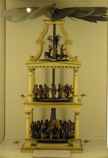 | Keywords: Christmas pyramid from about 1830.jpg en Old Christmas pyramid from about 1830 - first half of the 19 century From Germany Ore Mountains Ore Mountain folk art crafted at Schoenheide in the Ore Mountains Now to be seen in the Brush- and regional Museum at Schoenheide/Saxony de Weihnachtspyramide im Bürsten- und Heimatmuseum Schönheide/Erzgebirge - Text der Beschriftung im Museum um 1830 gehört zu den ältesten erhaltenen Pyramiden des Erzgebirges Ca 60 geschnitzte Figuren Erste Etage Bergaufzug und Handwerker Zweite Etage Darstellung der biblischen Weihnachtsgeschichte Maria und Josef auf der Flucht nach Ägypten Engel Soldaten Schriftgelehrter ¦ Dritte Etage Paradiesgärtlein mit Adam und Eva Baum mit Schlange exotischen Tieren Der 24 Dezember galt lange Zeit als Adam-und-Eva-Tag žDer klassische Drehturm aus Schönheide mit seiner Barockbekrönung mag auf die Zeit um 1830 zurückgehen Adolf Spamer Deutsche Volkskunst Sachsen Weimar 1954 žÃ„lteste geschnitzte Figuren des Bergaufzugs sind auf Pyramiden aus der ersten Hälfte des vergangenen Jahrhunderts gemeint ist das 19 Jahrhundert erhalten Claus Leichsenring Erzgebirgische Weihnachtspyramiden 1993 own Klaaschwotzer 2013-12-01 Christmas pyramids in Germany Ore Mountain folk art Christmas pyramids Christmas pyramid from about 1830 Cc-zero |