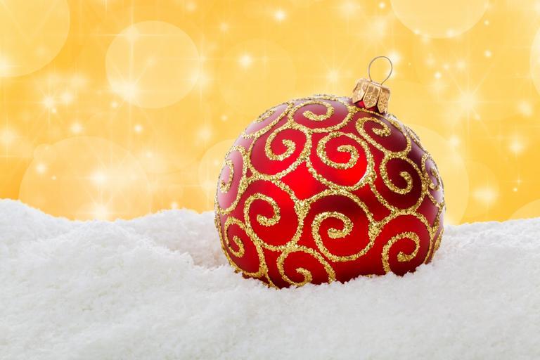 Keywords: christmas snow decoration holiday symbol winter xmas celebration december cold season merry ice seasonal red bauble new year red christmas ball golden background