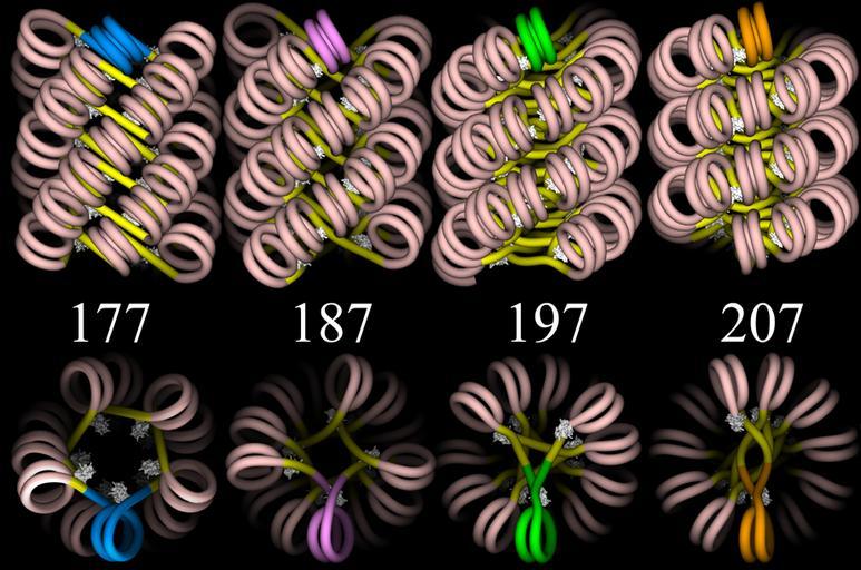 | Keywords: ChromatinFibers.png Four proposed structures of the 30 nm chromatin filament for DNA repeat length per nucleosomes ranging from 177 to 207 bp Linker DNA in yellow and nucleosomal DNA in pink Own 10/06/2007 Julien Mozziconacci Chromosomes Molecular biology |