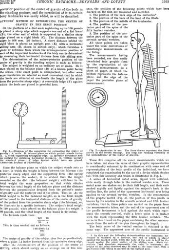 | Keywords: ChronicBackache1035.png CHRONIC BACKACHE--REYNOLDS AND LOVETT Journal of the American Medical Association Chicago Ill 1910 REYNOLDS Edwards AND LOVETT Robert W PD Image ChronicBackache1033 png PD-old <TABLE><TR><TD> posterior position of the center of gravity of the body in the standing posture; and the correlation of it to certain bony landmarks was easily added as will be described <center>AUTHORS' METHOD Of DETERMINING THE CENTER OF GRAVITY IN THE ERECT POSITION</center> On the platform of a dial scale registering up to 100 pounds is placed a sharp edge which supports one end of a flat board B the other end of which is supported by a similar sharp edge placed on a rigid block C The distance between the edges is 508 mm 20 inches A short distance behind the rigid block is placed an upright post E with a horizontal sliding arm D shown in section only which furnishes a plane of reference from which the artero-posterior position of each of the important landmarks of the body can be determined by measuring their horizontal distance from this sliding arm The determination of the antero-posterior position of the center of gravity in the standing subject is made as follows The subject is weighted on an ordinary set of scales He is then placed on the balance plane B at a known point facing the scales the exact point is unimportant but after some experimentation we selected as most convenient that in which the heels are situated at one-fourth the length of the plane from the posterior sharp edge A removable ledge F against which the heeds are placed is provided here Fig 1 -Diagram of the apparatus for estimating the center of gravity A scale B balance plane on which patient stands facing A C block supporting triangular edge D movable horizontal arm on upright for obtaining horizontal distances E vertical upright for standard plane F ledge against which heels are placed American Journal of Physiology Since the balance plane on which the subject stands acts as a lever in which the weight is borne between the fulcrum the posterior sharp edge and the supporting force the spring which governs the scales it is evident that the weight recorded on the dial the balanced weight will bear to the total weight the same proportion as that which obtains between the total length of the balance plane and the distance between the perpendicular dropped from the patient's center of gravity and the posterior end of the plane That is As the total weight is to the balanced weight so is the total length of the board to the horizontal distance of the center of gravity of the patient from the posterior sharp edge the fulcrum or to illustrate by a specific instance The subject's total weight is 140 pounds; when placed on the balance plane his weight is 50 pounds and the total length of the board is 20 inches The formula reads then <center> 140 20 --- -- 50 x </center> This is then worked out as follows <center><pre> 140 1000 7 1 980 ---- 200 </pre></center> The center of gravity of the suhject then lies perpendicularly above a point 7 1 inches forward from the posterior sharp edge After the determination of the position of the center of gravity which should occupy on an average one or two min- </TD><TD> ules the position of the following points which have been marked on the skin are measured and recorded The position of the back edge of the malleolus <ref>In this and the following determinations the horizontal difference is obtained hy a tootrule one end of which Is placed against the marked point while the body of the rule is held by the thumb against the upper surface of the sliding arm Since this surface and therefore necessarily the rule is horizontal the height of the point obserwd may be rend at the same time from a graduated scale which is marked on the upright post </ref> The position of the back of the head of the fibula The position of the middle of the trochanter The position of the posÂterior part of the spine of the fifth lumbar vertebra The position of the posterior part of the spine of the seventh cervical vertebra All these points are taken under the usual conventions of somatologic measurements on the living The measurements having been recorded are then easily translated into graphic form by the reproduction of the observed measurements on a sheet of paper of which the bottom represents the balance plane and the edge of the paper the posterior plane of measurement Fig 2 -Apparatus In use The lines drawn represent the lines shown In the record tracings The long line running vertically is the perpendicular of the center of gravity These five comprise all the exact measurements which we have taken but since the value of their graphic representation is considerably enhanced by its combination with some sort of representation of the body profile of the individual we have completed the examination by the use of a device which obtains this with fair accuracy and which is illustrated in Fig 2 A series of horizontal metal arms tipped with celluloid slide easily through holes in the vertical wooden arm These metal arms are shaken out to their full length and their ends pushed rapidly and lightly against the subject's back in the median line the point of the uppermost horizontal arm being applied to the seventh cervical vertebra In the construction of the graphic record Fig 4 the position of this profile is known by its relation to the seventh cervical and fifth lumbar vertebræ; that is these points are marked all the paper from the measurements taken and the end of the uppermost arm of the profile instrument is laid against the mark which represents the seventh cervical while a lower point is in contact with the mark representing the fifth lumbar vertebra The curve is then traced on the paper containing the other measurements from the ends of the pins throughout its length The body curve of the ventral surface is obtained in the same way The uppermost arm of the profile instrument is </TD></TR></TABL