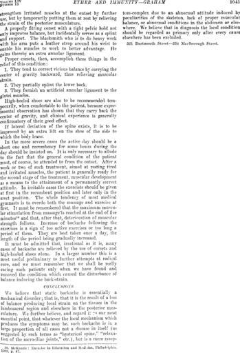 | Keywords: ChronicBackache1043.png CHRONIC BACKACHE--REYNOLDS AND LOVETT Journal of the American Medical Association Chicago Ill 1910 REYNOLDS Edwards AND LOVETT Robert W PD <TABLE><TR><TD> strengthen irritated muscles at the outset by further use but by temporarily putting them at rest by relieving the strain of the posterior musculature A properly fitting corset with a tight pelvic hold not only improves balance but incidentally serves as a splint and support The blacksmith who is to do heavy work with his arm puts a leather strap around his wrist to enable his muscles to work to better advantage He gains thereby an extra annular ligament Proper corsets then accomplish three things in the relief of this condition They tend to corred vicious balance by carrying the center of gravity backward thus relieving muscular shain They partially splint the lower back They furnish an artificial annular ligament to the glutei museles High-heeled shoes are also to be recommended temporarily when comfortable to the patient because experimental observation has shown that they carry back the center of gravity and clinical experience is generally confirmatory of their good effect If lateral deviation of the spine exists it is to be improved by an extra lift on the shoe of the side to which the body leans In the more severe cases the actiye day should be a short one and recumbency for some hours during the day should be insisted on It is only necessary to allude to the fact that the general condition of the patient must of course he attended to from the outset After a week or two of such treatment aimef1 at resting tired and irritated muscles the patient is generally ready for the second stage of the treatment mmeular development as a means to the attainment of a permanently correct attitude In irritable cases the exercisès should be given at first in the recumbent position and later only in the erect position The whole temleney of most medical gymnasts is to overdo hoth the massage and exercise at first It must be remembered that the maximum museular stimulation from massage is reached at the end of five minutesl0 and that after that deterioration of muscular strength follows Increase of backache following the execises is a sign of too active exercises or too long a period of them They are hest taken once a day the length of the period being gradually inereased It must be admitted that irrational as it is many cases of backache are relieved try the use of corsets and hig-heled shoes aloue In a larger number this is a most useful preliminary to further attempts at radical cure and we mUcit remember that we shall be really curing such patients only when we have found and removed the condition which cansed the disturbance of balance induring the bark-strain <center><i>CONCLUSIONS</i></center> We beliere that static backache is essentially a mechanical disorder; that is that it is the result of loss of balanee producing local strain on the tissues in the lumbosacral region and elsewhere in the posterior musculature We further belieye nnd regard it is our most essential point that whatever the local mechanism which produces the symptoms may be such backache is in a large proportion of all cases not a disease in itself as suggested by such terms as hysterical spine relaxation of the sacro-iliac joints etc hut is a mere symp- 10 McKenzie Exerise in Education and Medicine Philadelphia 1909 p 47 </TD> <TD> tom-complex due to an abnormal attitude induced by peculiarities of the skeleton lack of proper muscular balance or abnormal conditions in the abdomen or elsewhere We believe that in diagnsis the local condition should be regarded as primary only after every cause elsewhere has been exeluded 321 Dartmouth Street-234 Marlborough Street </TD></TR></TABLE> PD-old Permanent corset treatment Reynolds and Lovett - Chronic Backache |
