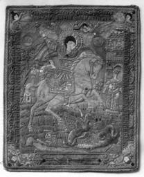 Keywords: Chrysanthos - Icon of Saint George Slaying the Dragon - Walters 83332.jpg This embroidery probably hung as an offering beneath a larger painted image of St George It depicts two legendary exploits of the 4th-century Christian martyr Seated on the saddle behind him is a boy whom George miraculously delivered from Muslim captivity and returned home At the same time the saint is saving a princess from the dragon that is about to devour her 1792 Modern silk and metal-thread embroidery on silk pearls green stones cm 32 07 26 04 accession number 83 332 11808 Henry Walters Baltimore date and mode of acquisition unknown Walters Art Museum Henry Walters Acquired by Henry Walters Translation below the image + Work of me Chrisanthus the Cypriot deacon of the Church of Saint Constantine at Koukouma 1792 around the image starting above it and continuing on its right and left sides O miracle-worker George receive the prayer of your servant pilgrim George with his consort and children parents and brothers Ottoman Embroideries and Other Ornament The Walters Art Museum Baltimore 2007 place of origin Cyprus Walters Art Museum license Byzantine and Early Russian art in the Walters Art Museum Textiles in the Walters Art Museum Chrysanthos Icons of Saint George and the Dragon 1792 Media contributed by the Walters Art Museum needs category review