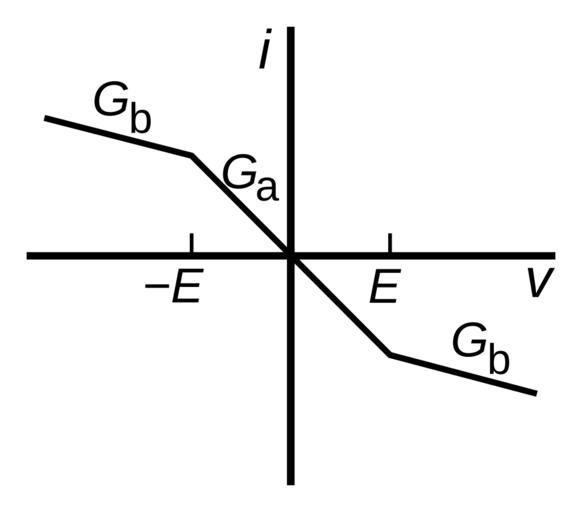 | Keywords: Chua diode characteristic curve.svg characteristic curve of Chua's diode or nonlinear resistor a nonlinear electronic component used in Chua's circuit a simple electronic circuit that displays chaotic behavior Chua's circuit invented by Leon Chua in 1983 is one of the simplest chaotic systems and is widely used as a reference example of chaos The function is piecewise-linear made of three straight line segments The inner segment has a slope conductance of G<sub>a</sub> The outer segments which begin at the voltage breakpoint ±E have a shallower slope of G<sub>b</sub> The line is in the 2nd and 4th quadrants of the IV plane which represents a negative resistance and so requires active energy producing elements like amplifiers in it Typical circuits used to realize it consist of an op amp circuit called a negative impedance converter NIC in parallel with a resistor-diode network 2014-02-07 21 15 41 own Chetvorno cc-zero Uploaded with UploadWizard Negative resistance Chaos oscillators Device current-voltage characteristics |