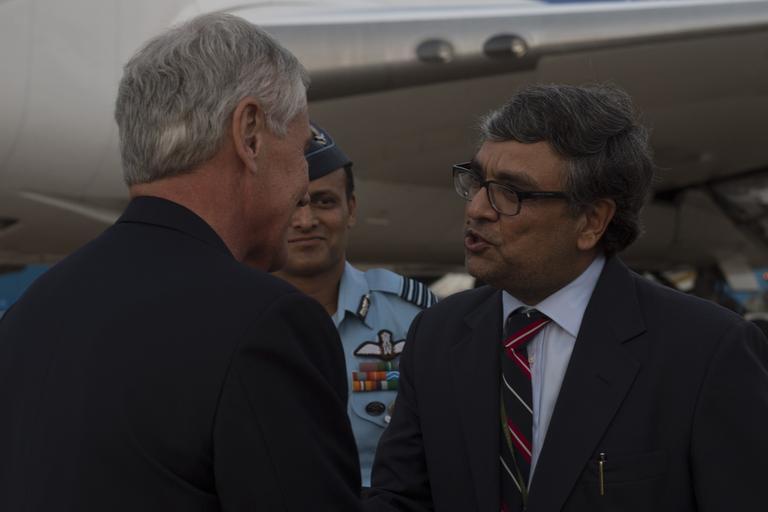 Keywords: Chuck Hagel greeted by officials at IGI Airport 2.jpg New Delhi India Aug 7 2014 -- Secretary of Defense Chuck Hagel is greeted by senior U S and Indian Defense officials at Indira Gandhi International Airport in New Delhi India August 7 2014 DoD photo by Petty Officer 2nd Class Sean Hurt/Released https //www flickr com/photos/secdef/14669799497/ 140807-N-AF077-229 2014-08-07 09 40 https //www flickr com/people/68842444 N03 Ash Carter PD-USGov Secretary of Defense https //flickr com/photos/68842444 N03/14669799497 2015-12-11 09 56 07 United States Government Work Chuck Hagel in India 2014 at Indira Gandhi International Airport |