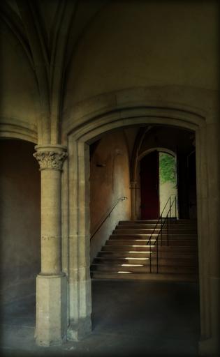 Keywords: church cathedral architecture stairs arcades goal door cloister pillar input building portal architectural style historically antique incidence of light lichtspiel old stair step mystical darkness basilica trier germany