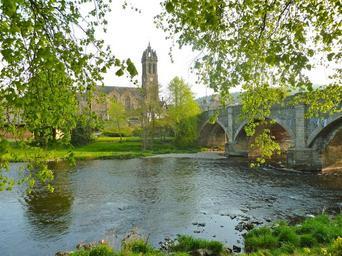 Keywords: church river village outside nature water bridge religion building architecture trees leaves environment green tree sunlit colorful landscape