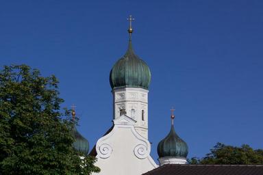 Keywords: church steeple onion dome copper roof cross gilded architecture sky blue