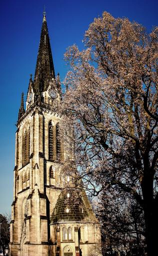 Keywords: church steeple sky kassel tower tree blue old building at the stern