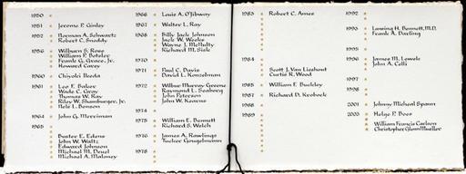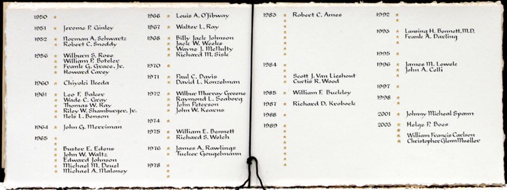 Keywords: CIA Book of Honor open enlarge.jpg The Book of Honor Originating in 1974 and designed by Harold Vogel the glass-encased Book of Honor containing 48 names of the 83 honored on the Memorial wall sits on a marble shelf below the Wall Each name is inscribed using calligraphy on handmade paper with a gold star before each name Names not revealed are signified by just the gold star After inscribing the paper is placed in a black leather book which is hand bound in Moroccan goat skin with a gold embossed CIA seal on its cover http //www odci gov/cia/information/tour/book html Original source of photo http //www odci gov/cia/information/tour/open_book_enlarge jpg License Public Domain Work of a CIA a United States Government Agency PD-USGov original upload log page en wikipedia CIA_Book_of_Honor_open_enlarge jpg 2005-10-28 09 58 Kgrr 950×356×8 357369 bytes <nowiki>The Book of Honor Originating in 1974 and designed by Harold Vogel the glass-encased Book of Honor containing 48 names of the 83 honored on the Memorial wall sits on a marble shelf below the Wall Each name is inscribed using calligraphy on handma</nowiki> CIA Memorial Wall |