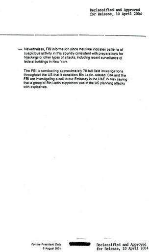 Keywords: CIA Memo2.jpg Page 2 of 2 from a CIA memo dated August 2001 concerning a possible attack by Bin Laden on the United States of America Original text en wikipedia by en User Andrei Stroe using http //tools wikimedia de/~magnus/commonshelper php CommonsHelper <br/> original text 1 National Security Archives 6 August 2001<br/> first version ; last version Unknown CIA Wiki1609 wikipedia en Later version s were uploaded by Noahcs at http //en wikipedia org en wikipedia Wiki1609 wikipedia en Original text PD-USGOV-CIA <br/> original text 1 Declassified by the US Government on 10 April 2004 60px page 1 of 2 Original upload log en wikisource Billinghurst CommonsHelper en wikisource Memo2 jpg 2006-07-10 01 21 Sherurcij 1120×1859× 161485 bytes <nowiki></nowiki> CIA documents Secrecy Documents of the government of the United States Osama bin Laden PD-USGov |