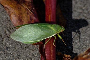 Keywords: cicada insect close-up green leaf camouflage wild stem red ground queensland australia