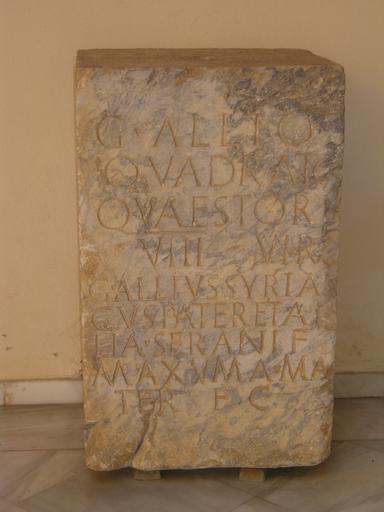 | Keywords: CILII,724.JPG es Inscripción CIL II 724 procedente de Alburquerque Badajoz depositada en el Museo Arqueológico Provincial de Badajoz cuyo texto dice G aio · ALLIO/ QVADRATO/ QVAESTORI/ VIII octo VIR o / G aius · ALLIVS· SYRIA/CVS· PATER ET AL/LLIA· SERANI· F ilia / MAXVMA· MA/TER F aciendum · C uravit · es Hispania Epigraphica http //eda-bea es/pub/record_card_1 php refpage 2Fpub 2Fsearch_select php quicksearch CIL+II 2C+724 page 2 rec 21702 21702 own Caligatus Ancient Roman inscriptions in Extremadura Linked to HEp CIL II 000724 Museo Arqueológico Provincial de Badajoz |