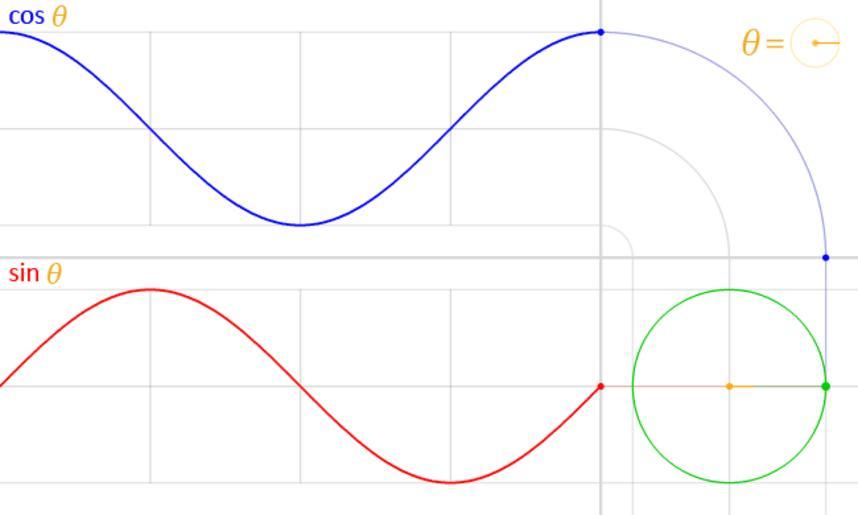 | Keywords: Circle cos sin.gif en We have the unit circle with radius 1 in green placed at the origin at the bottom right In the middle of this circle in yellow is represented the angle theta θ This angle is the amount of counter-clockwise rotation around the circle starting from the right on the x-axis as illustrated An exact copy of this little angle is shown at the top right as a visual illustration of the definition of θ At this angle and starting at the origin a faint green line is traced outwards radially This line intersects the unit circle at a single point which is the green point spinning around at a constant rate as the angle θ changes also at a constant rate The vertical position of this point is projected straight along the faint red line onto the graph on the left of the circle This results in the red point The y-coordinate of this red point the same as the y-coordinate of the green point is the value of the sine function evaluated at the angle θ that is y coordinate of green point sin θ As the angle θ changes the red point moves up and down tracing the red graph This is the graph for the sine function The faint vertical lines seen passing to the left are marking every quadrant along the circle that is at every angle of 90° or Ï /2 radians Notice how the sine curve goes from 1 to zero to -1 then back to zero at exactly these lines This is reflecting the fact sin 0 0 sin Ï /2 1 sin Ï 0 and sin 3Ï / 2 -1 A similar process is done with the x-coordinate of the green point However since the x-coordinate is tilted from the usual convention to plot graphs where y f x with y vertical and x horizontal an untilt operation was performed in order to repeat the process again in the same orientation instead of vertically This was represented by a bend seen on the top right Again the green point is projected upwards along the faint blue line and this bent projection ends up in the top graph ™s rightmost edge at the blue point The y-coordinate of this blue point which due to the bend in the projection is the same as the x-coordinate of the green point is the value of the cosine function evaluated at the angle θ that is x coordinate of green point cos θ The blue curve traced by this point as it moves up and down with changing θ is the the graph of the cosine function Notice again how it behaves at it crosses every quadrant reflecting the fact cos 0 1 cos Ï /2 0 cos Ï -1 and cos 3Ï /2 0 own LucasVB 2014-03-16 Trigonometry Trigonometric functions Sine function Cosine function Mathematical animations |