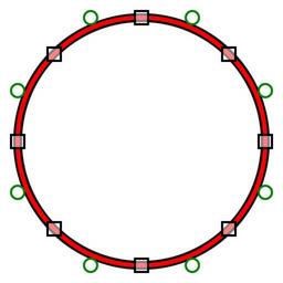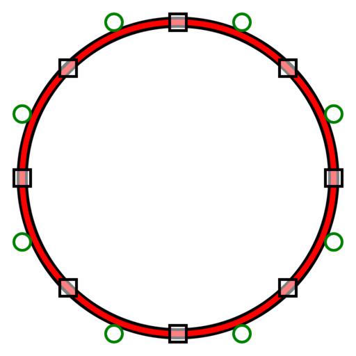 Keywords: Circle and quadratic bezier.svg Bézier spline approximation in red overlayed on a black circle of radius 112 units with tangent on-curve control points drawn as squares and off-curve control points drawn as circles The spline's on-curve control points are placed at the circle's horizontal and vertical tangent points and at displacements 79 79 from the center and its reflections about the X and Y axes Off-curve control points are placed at the intersections between the horizontal and vertical tangent line and 45-degree lines from the diagonal control points own Damian Yerrick 2009-10-15 Circle geometry Typographic software Splines |