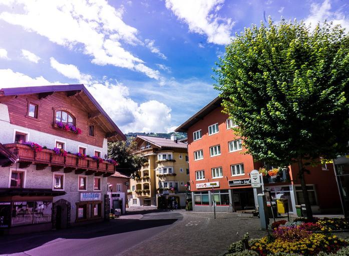 Keywords: city buildings houses tree flowers sidewalk st johann austria europe